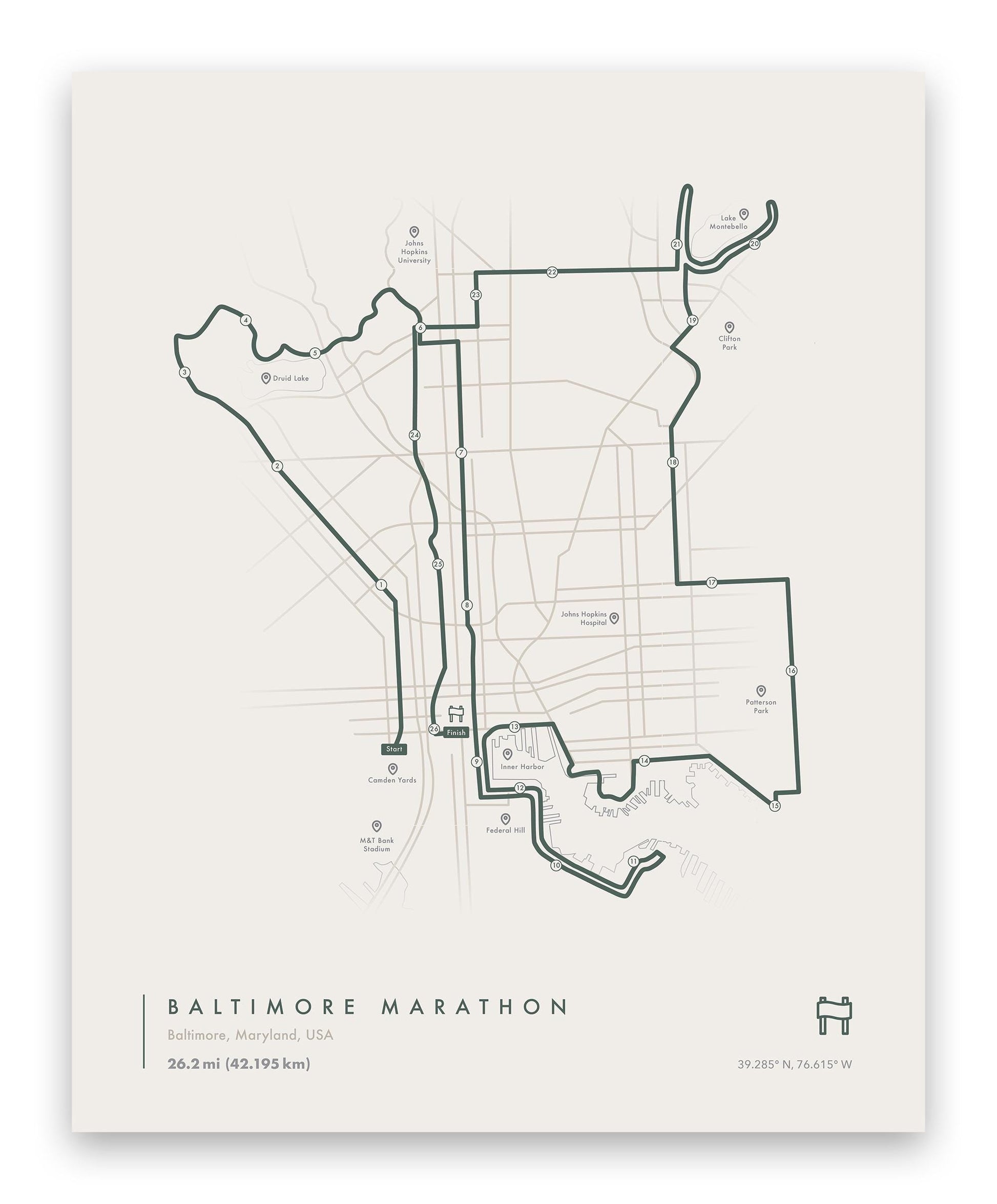 Celebrate your 26.2 miles through Baltimore with this minimalist marathon route print. Featuring the official Baltimore Marathon course — starting near Camden Yards, winding through Druid Hill Park, Clifton Park, Lake Montebello, and finishing downtown at the Inner Harbor. Each Path & Peak Art Co. print is designed for runners who want to commemorate their accomplishment with modern design and meaningful detail.