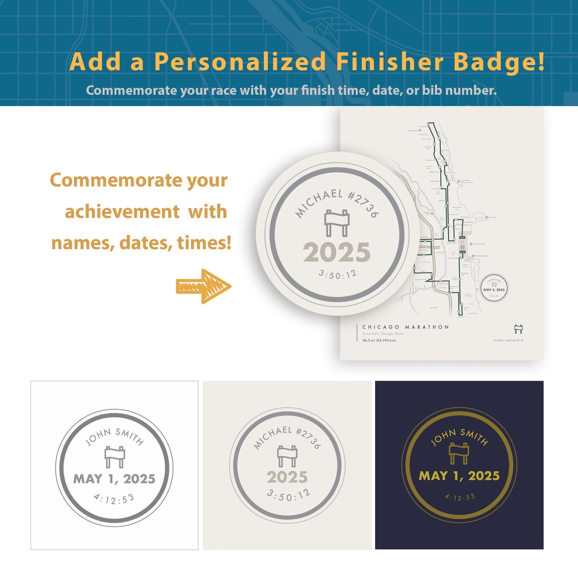 Add custom badge text such as your name, finish time, or completion date. If you selected the personalized version, please enter your text below: