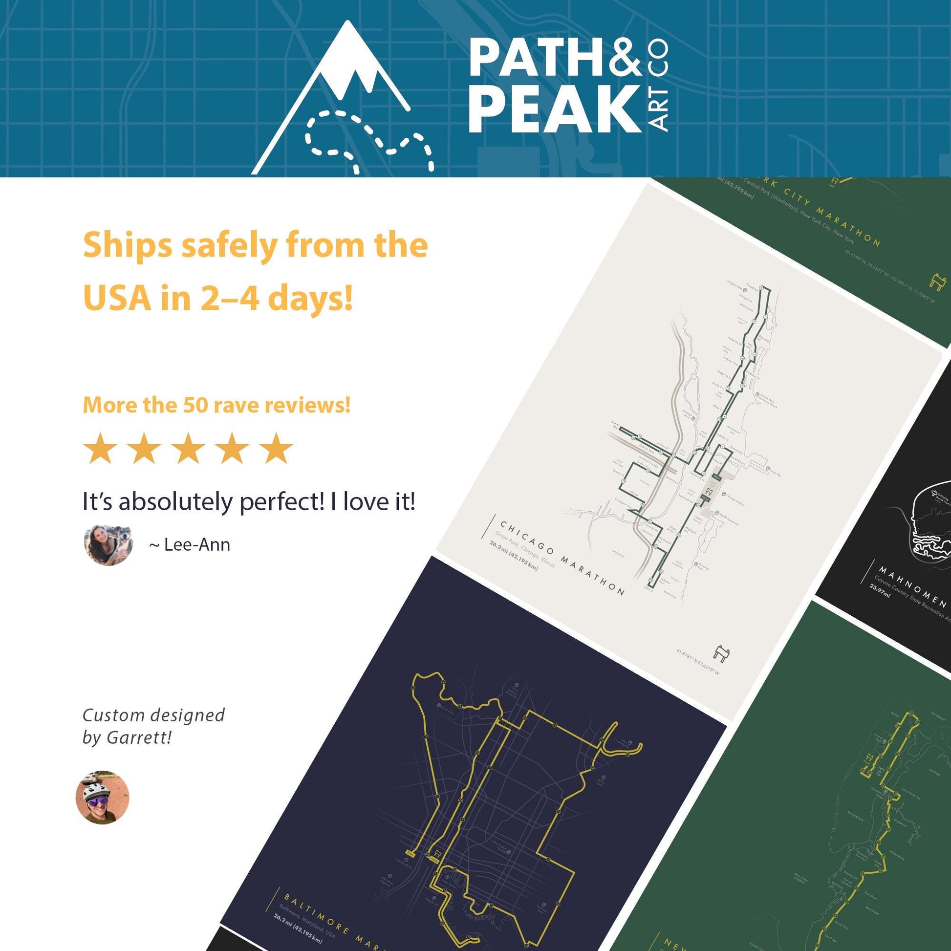 Designed for runners, collectors, and fans of clean modern design, this minimalist map highlights the official 26.2-mile (42.195 km) route — perfect for commemorating your race accomplishment or gifting to a proud finisher.