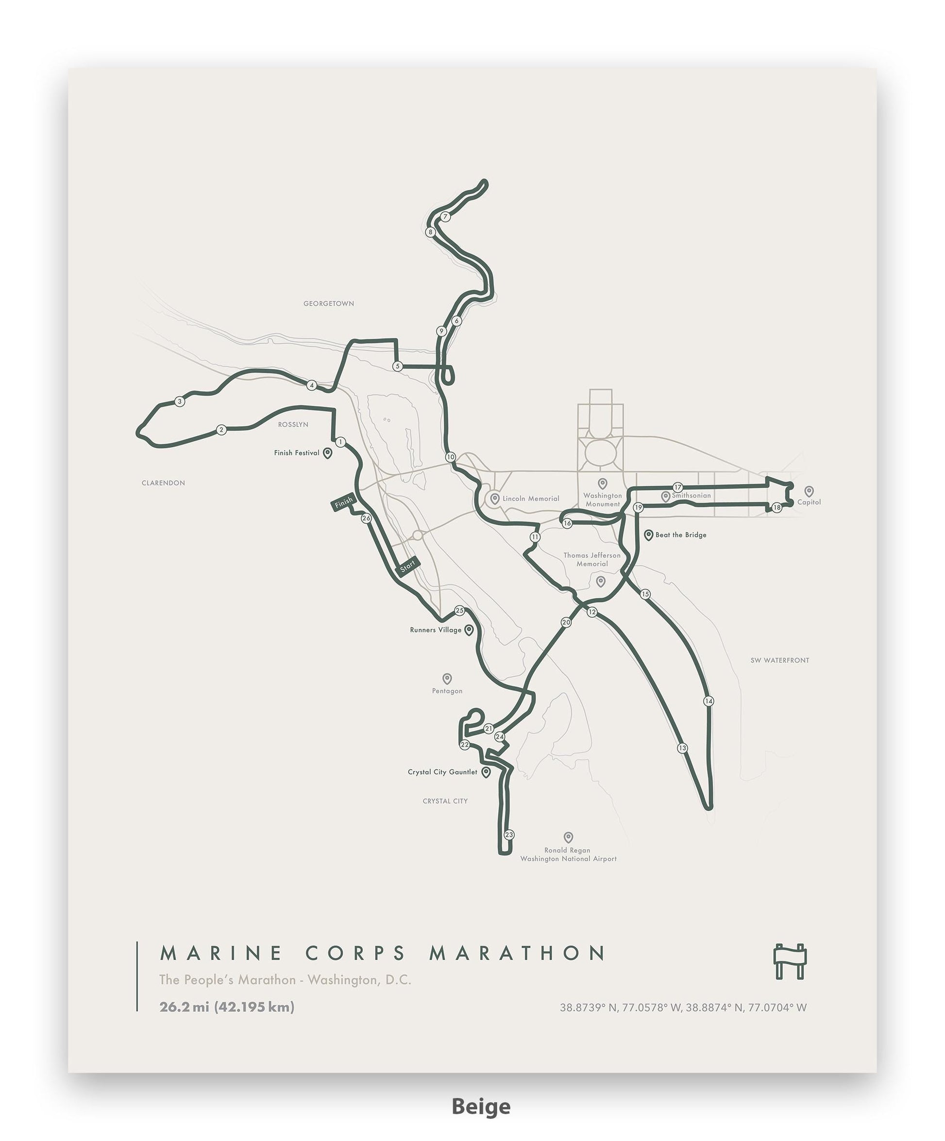 Celebrate The People’s Marathon with this detailed route map of the Marine Corps Marathon, a Washington, D.C. classic that winds past the Pentagon, National Mall, and iconic memorials before finishing at the Marine Corps War Memorial (Iwo Jima).